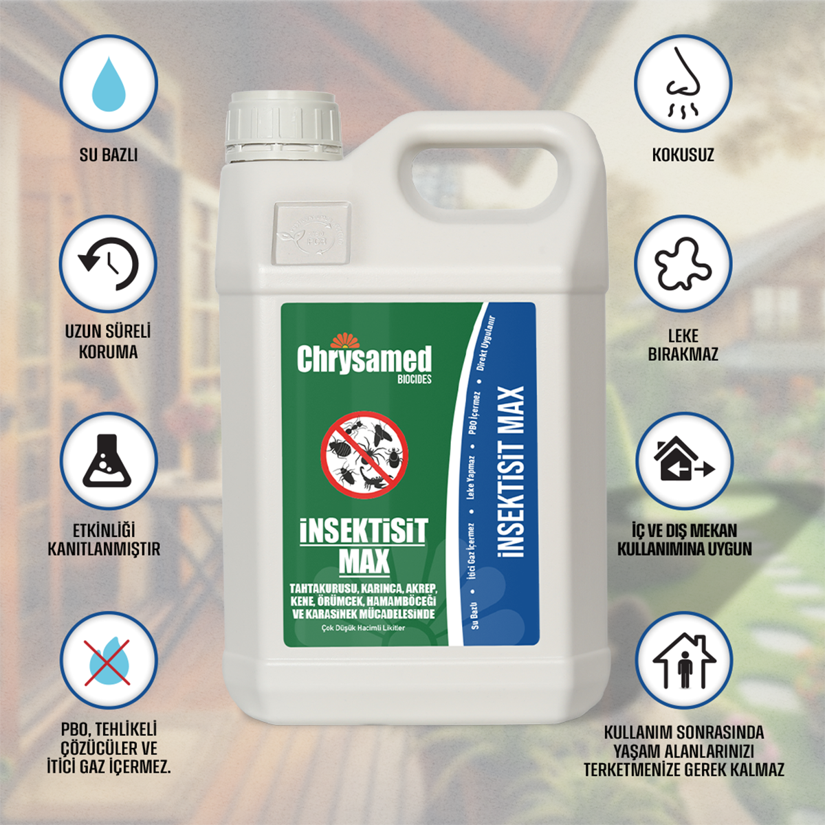 Chrysamed Insektisit Max;  karasinek, hamam böceği, karınca,  tahtakurusu, örümcek, kene, akrep gibi trake sistemi ile solunum yapan böceklere karşı öldürme ve uzaklaştırma (repellent) etkisine sahip genel böcek bir ilacıdır. Etkisi kalıcıdır. Bulunduğu ortamda 3 aya kadar uzaklaştırıcı etki sağlar. İç mekan ve dış mekan kullanımına uygundur.